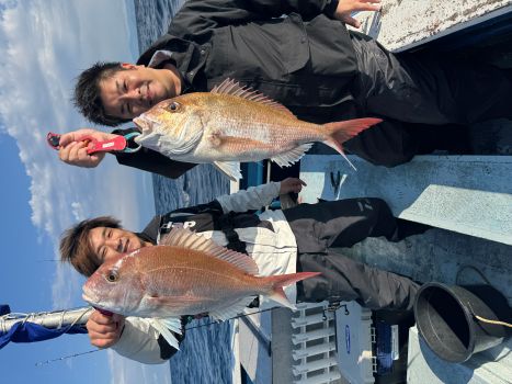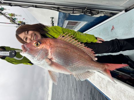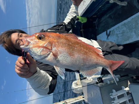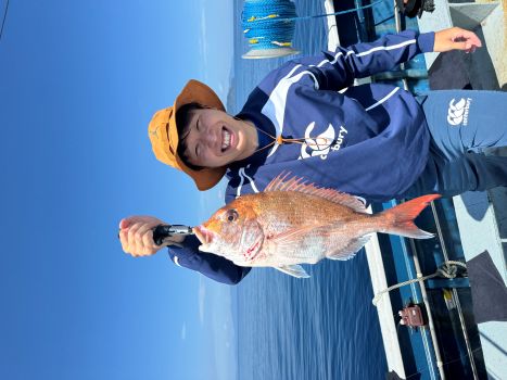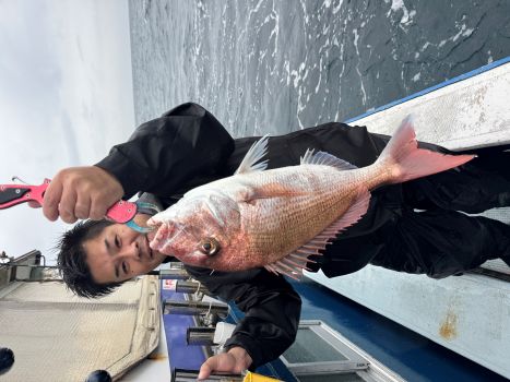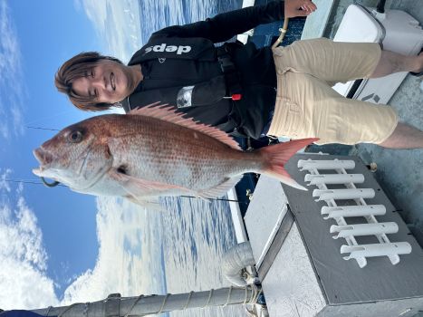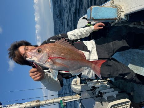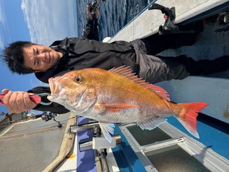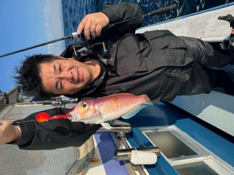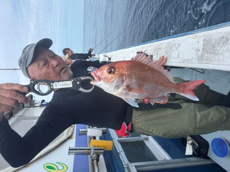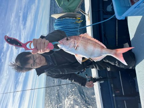 久しぶりの出船で前半は真鯛探しに、ファーストヒットは真鯛がポロっと、