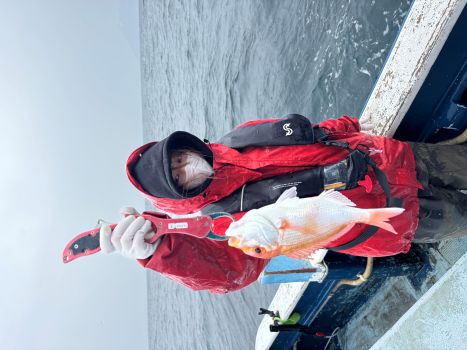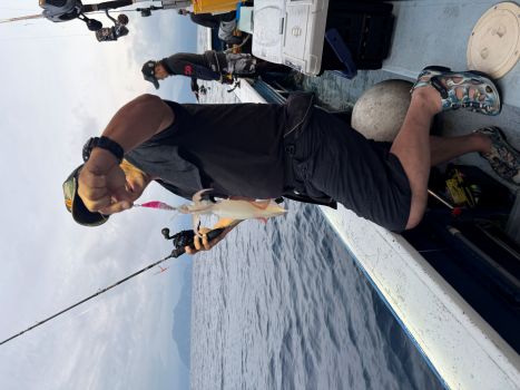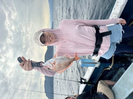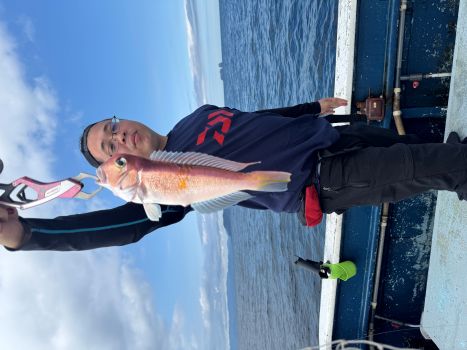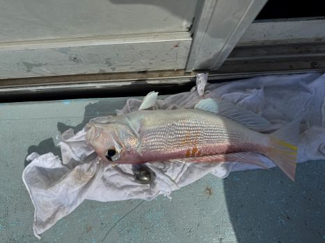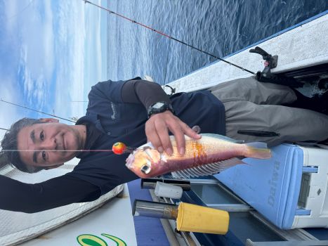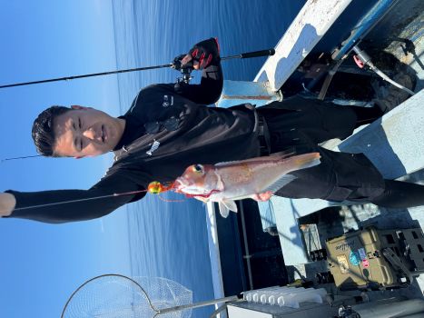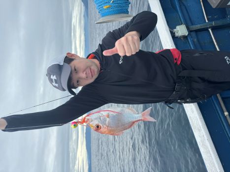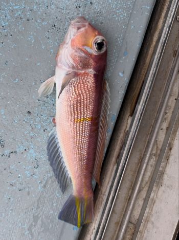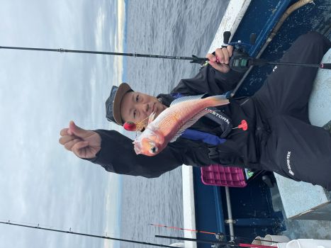 前半から赤物探しに、潮無し風無しのバーチカル状態で苦戦してました。活性良いのはエソばかりでレンコダイ・アオハタなど釣れてましたが数が伸びずで中盤ようやく真鯛の顔が見れアタリは出るのですがアジが口切れしてバレるかイカがタイラバのヘッドにアタッてバレるかでアジは上がればメガサイズ、オモリグ仕掛けを落とせばなんとマイカがポロっとスルメも混じりでDAYイカメタルでしたね、後半まで潮も風モタモタで苦戦のでしたがカイワリ・カナガシラ・レンコダイ・アオハタ・鯖・アジなど色々釣れた一日でした。