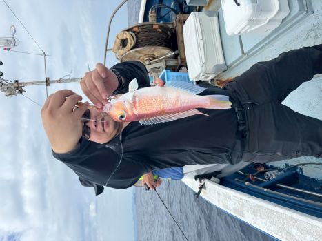 前半は赤物探しに、本日少し遅目の出船でポイントに到着した時には風が強くドタバタでしかも潮は激流で釣りにならなかったです。